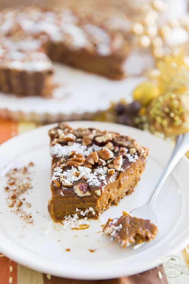 Raw Pumpkin Pie This re-imagined pumpkin pie is the perfect way to indulge your pumpkin obsession without even turning on the oven. This paleo treat combines cashew pumpkin custard with a nut-date base. Get the Recipe Per serving: 230 calories, 15.1 g fat (2.7 g sat), 21.6 g carbs, 14.1 g sugar, 4.7 mg sodium, 5.7 g fiber, 4.6 g protein Courtesy
