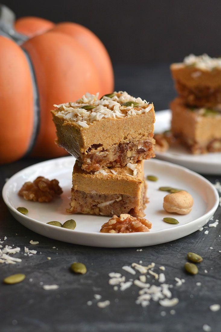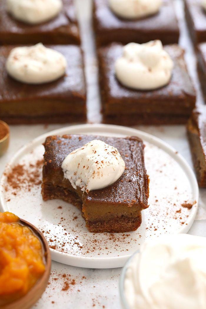Healthy Pumpkin Pie Bars Make these easy, six-step pumpkin pie bars and your guests will think you spent the whole day baking. Their crust is made with almond flour, spices, and maple syrup, making these bars a dairy-free and gluten-free treat. Get the Recipe Per serving: 144 calories, 7 g fat, 17 g carbs, 15 g sugar, 58 mg sodium, 1 g fiber, 3 g protein Courtesy