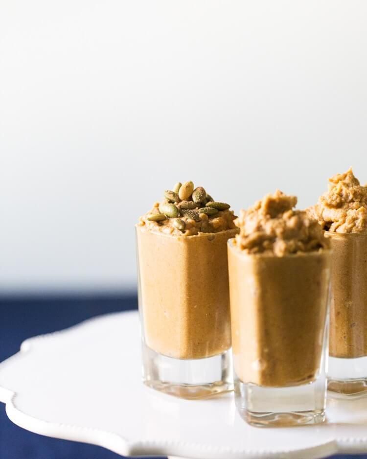 Pumpkin Mousse Shooters Okay, how cute are these little pumpkin mousse shooters? Vegan, dairy-free, and gluten-free, they taste like light and airy pumpkin pie filling. Get the Recipe Per serving: 247 calories, 16.4 g fat, 24.8 g carbs, 15.2 g sugar, 4 g fiber, 4.7 g protein Courtesy