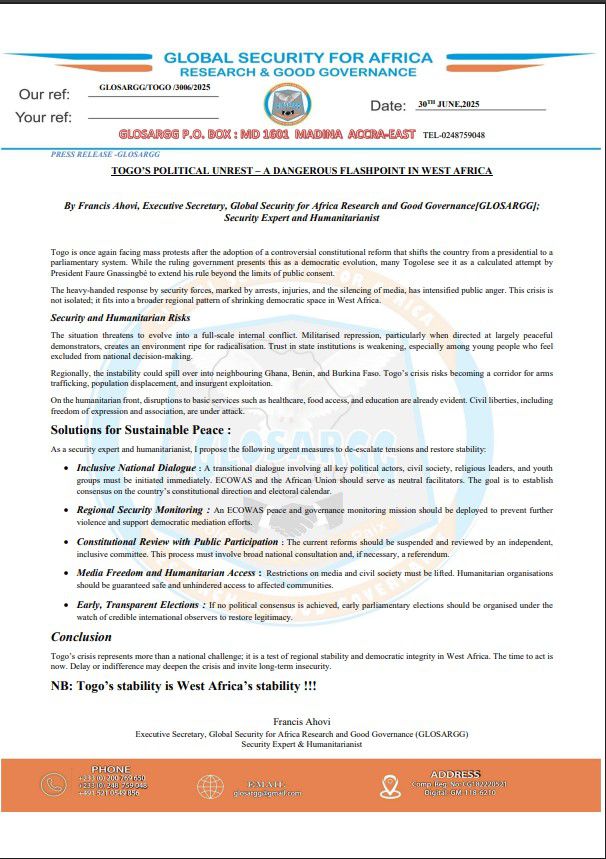 Togo Protests: GLOSARGG demands urgent ECOWAS, AU intervention amid rising tensions