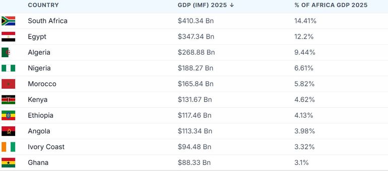 South Africa leads the continent with a GDP of $410.34 billion, representing 14.41% of Africa’s total economic output. Its strength lies in a highly diversified economy that spans mining, manufacturing, financial services, telecommunications, and tourism. With sophisticated infrastructure and a strong financial market, South Africa continues to serve as a hub for innovation, investment, and international business. Johannesburg and Cape Town anchor the country’s position as a global gateway, even as the nation navigates challenges such as energy instability and political shifts.