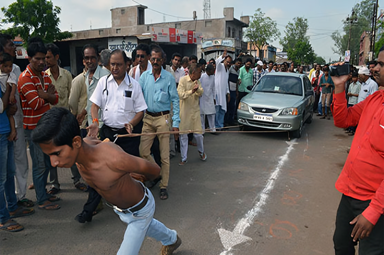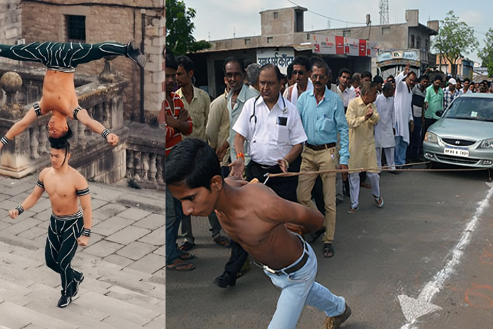 Abhishek Choubey from India set a new benchmark for strength in February 2023 by pulling a vehicle weighing 1,294.8 kg (2,854.54 lb) with his shoulder blades. The record-breaking pull took place on the set of Lo Show Dei Record in Milan, Italy, on 13 February 2023.
