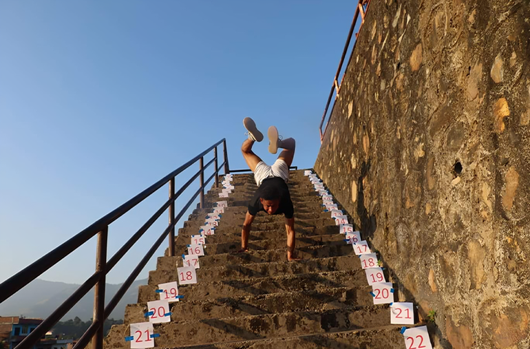 While many may struggle to walk on their hands, Hari Chandra Giri from Nepal took it to another level by walking 50 metres on his hands with a football (soccer ball) balanced between his legs. The record, set on 4 May 2022 in Kathmandu, Nepal, was completed in 25.58 seconds.
