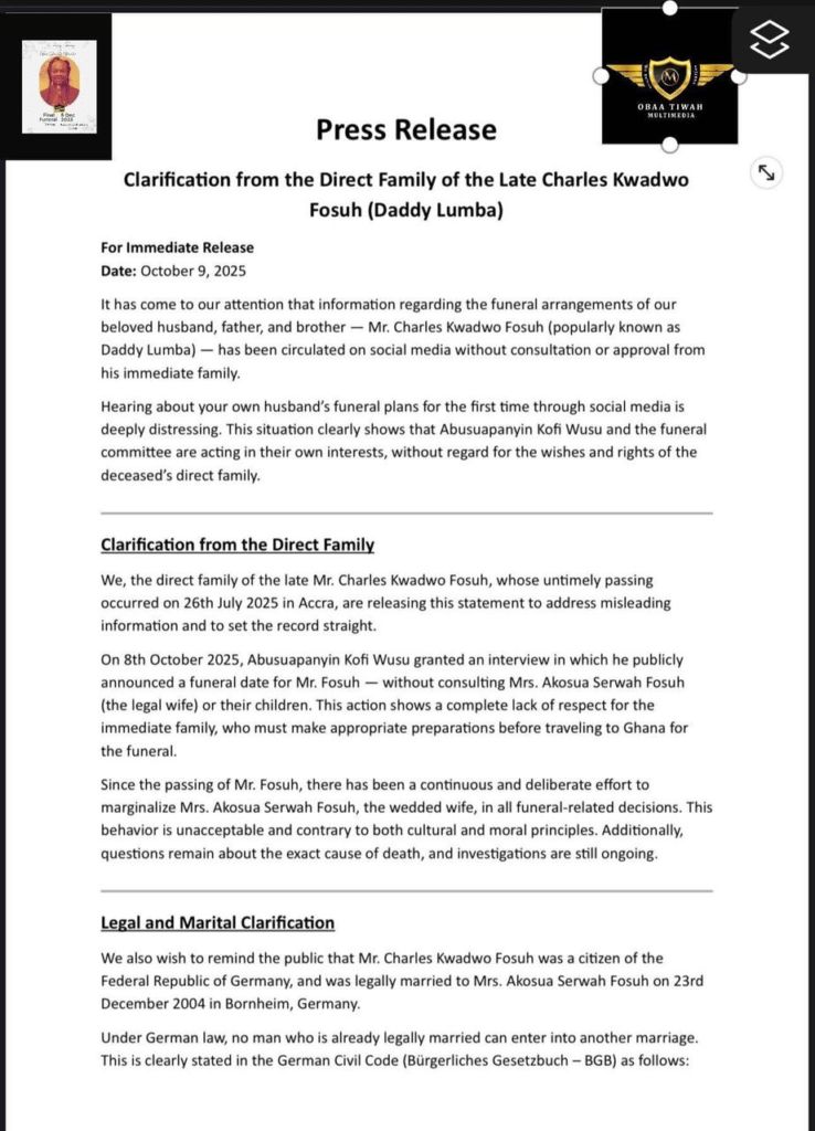 On 8 October 2025, Abusuapanyin Kofi Wusu granted an interview in which he publicly announced a funeral date for Mr Fosuh without consulting Mrs Akosua Serwah Fosuh (the legal wife) or their children. This action shows a complete lack of respect for the immediate family, who must make appropriate preparations before travelling to Ghana for the funeral.