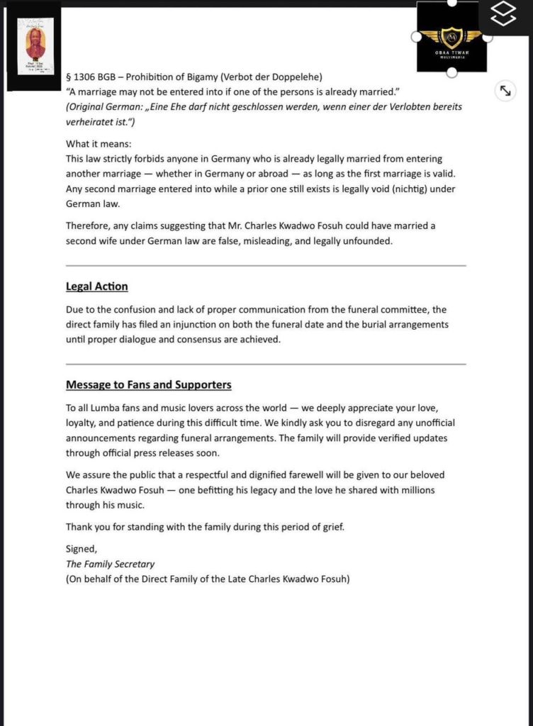 Due to the confusion and lack of proper communication from the funeral committee, the direct family has filed an injunction on both the funeral date and the burial arrangements until proper dialogue and consensus are achieved.