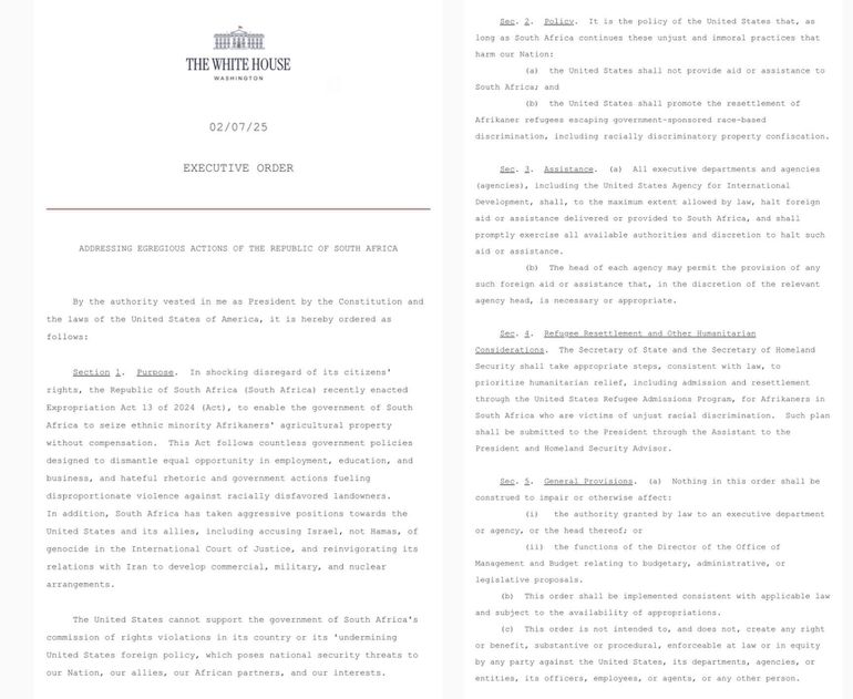 The executive order stated that the US will not support South Africa's human rights violations and will withhold funding until they end.