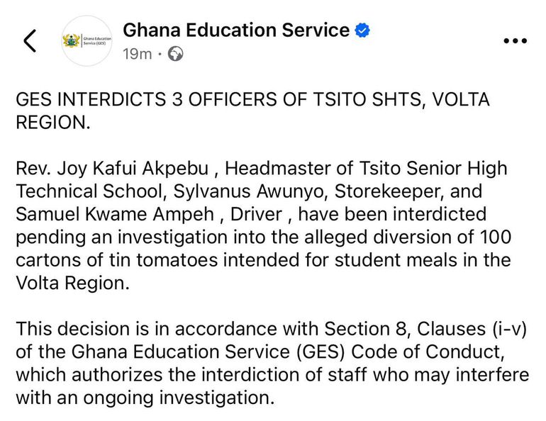 Headmaster for Tsito Secondary Technical School in the Volta Region, Rev. Joy Kafui Akpebu, has been interdicted by the Ghana Education Service along with two other staff members.