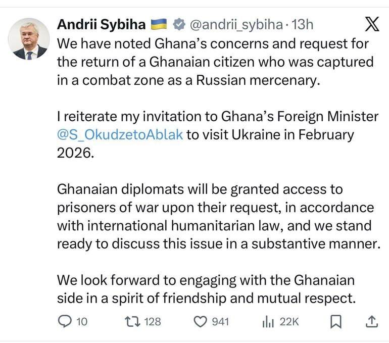 The announcement came via a tweet on Wednesday, 7 January 2026, from Andrii Sybiha, Ukraine’s Minister of Foreign Affairs, following Ghana’s request for the return of its citizen, who is reported to have been captured while fighting as a Russian mercenary.