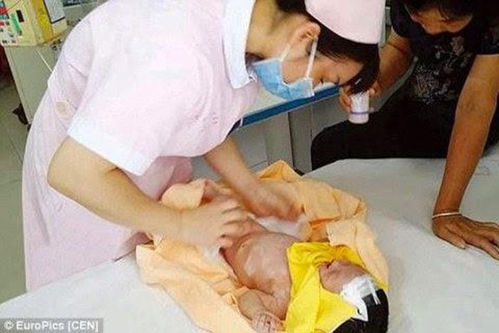 Newborn baby who was burind by his parents who were disappointed to find out that, he was with a cleft lip after his birth, has been found alive after for 8 days in a cemetery in the mountains of Guangxi province in southern China.