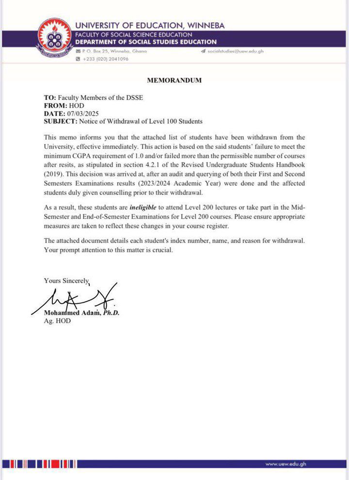 This decision was communicated in a memo dated 7th March 2025, signed by Mohammed Adam, PhD, the Head of the Department of the Faculty of Social Science Education, Department of Social Studies Education, at the university.