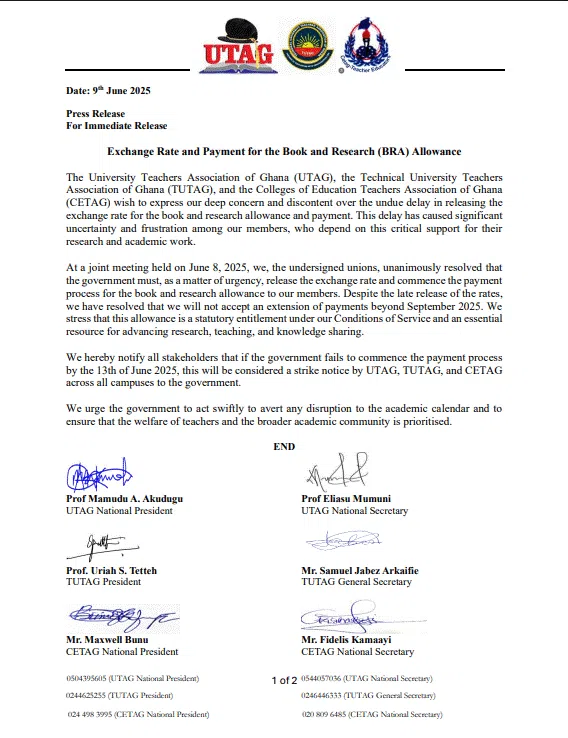The unions therefore cautioned the government that failure to commence the payment process by 13 June 2025 would be considered a formal strike notice from UTAG, TUTAG, and CETAG across all campuses.