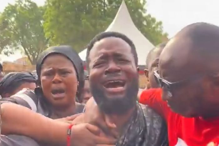 The husband of the nurse who tragically lost her life along with her three children in a fire outbreak in Kumasi has been seen mourning inconsolably at their funeral.