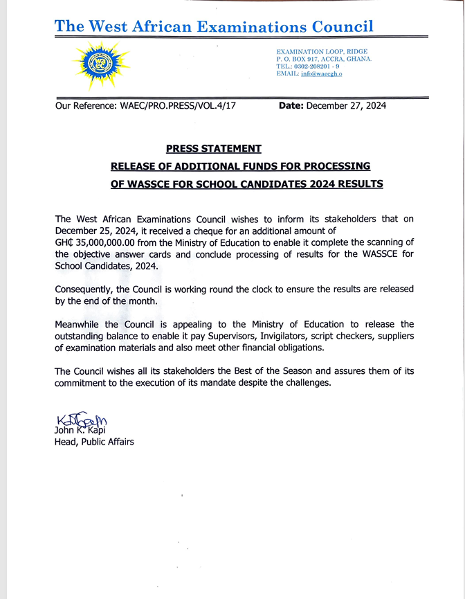 However, the matter has since been resolved and the Council through a statement signed by its Public Relations Officer, John Kapi, on Friday, December 27, 2024, confirmed receiving the GH₵35 million to complete results processing.