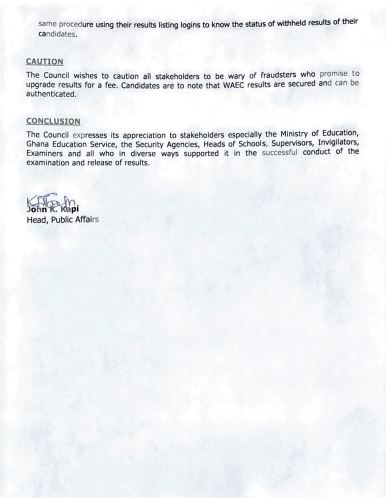 The Council expressed its appreciation to the Ministry of Education, the Ghana Education Service, security agencies, heads of schools, supervisors, invigilators and examiners for their contributions to the successful conduct of the examination and the release of the results.