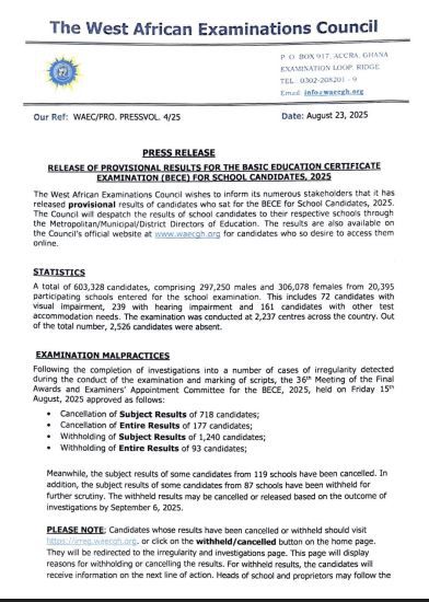 The West African Examinations Council (WAEC) has released the provisional results for candidates who sat the 2025 Basic Education Certificate Examination (BECE).
