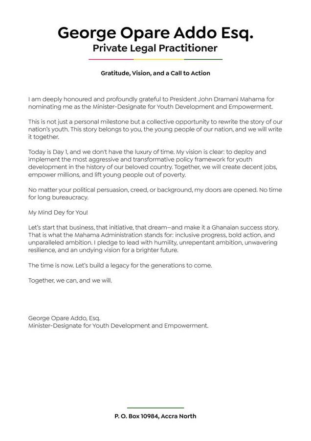 In an acceptance statement on January 16 following his nomination, he expressed gratitude to President John Dramani Mahama, describing it as a collective opportunity to transform the future of Ghanaian youth. Opare Addo pledged to implement aggressive and transformative policies to advance youth development in the country.
