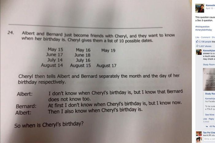 A logic problem that was posted on Facebook by Singapore television host Kenneth Kong has got the Internet twisted into knots as everyone is trying to find Cheryl's birthday.