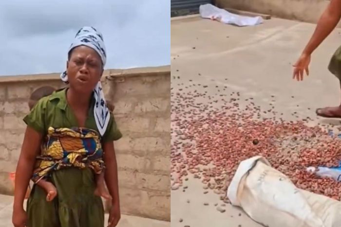 In a video shared by Askghmedia on X, the unidentified woman expressed frustration over the family’s worsening financial situation, despite her husband’s efforts in farming cocoa and maize. She claimed that the lack of buyers for their produce has left the family struggling to survive.