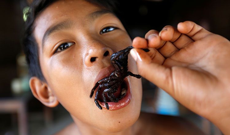 In Cambodia, particularly the town of Skuon, fried tarantulas are a popular snack. The Cambodian zebra tarantula, although venomous, becomes safe to eat once deep-fried.