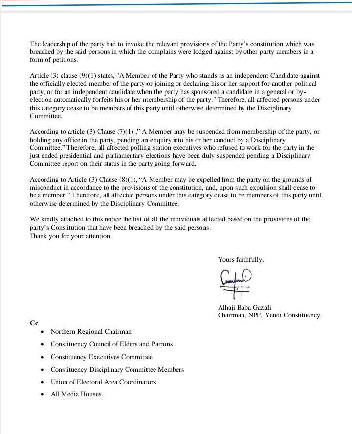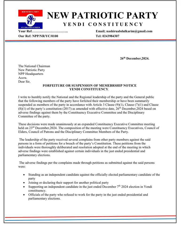The letter, dated 16th December, indicated that, effective immediately, the expelled individuals are no longer members of the NPP. They are barred from holding any positions in the party, attending meetings, or using the party’s symbols and flags.