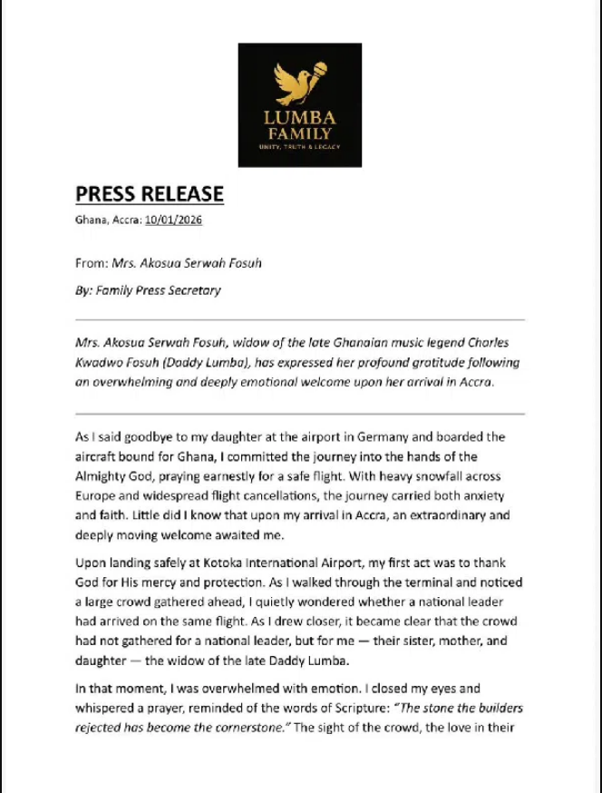 Akosua Serwaa, widow of the late Highlife legend Daddy Lumba, returned to Ghana from Germany to a warm welcome from supporters and members of Team Legal Wives, expressing deep gratitude for the overwhelming show of solidarity amid ongoing family and legal disputes.