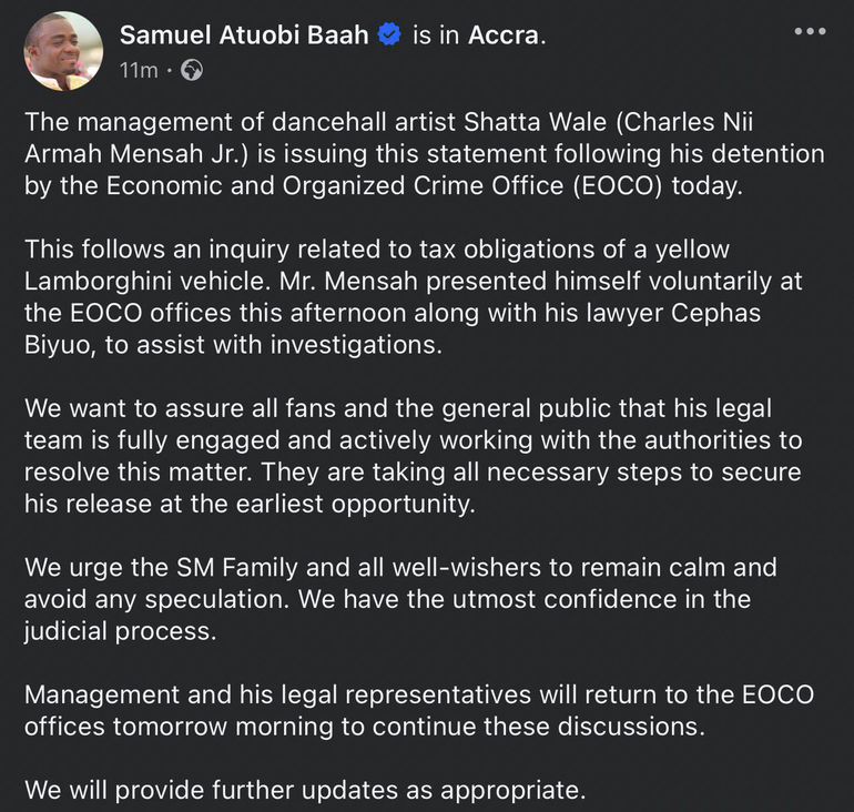 Full details here: Shatta Wale detained by EOCO less than 24 hours after flaunting new-acquired $260K Lamborghini