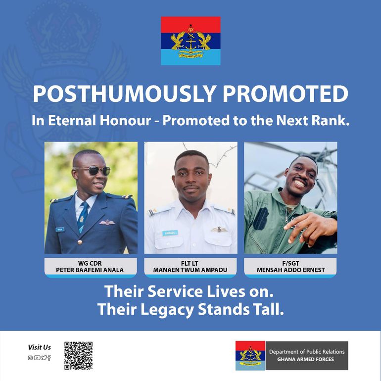 President John Dramani Mahama has announced posthumous promotions for three crew members who died alongside five senior officials in the 6 August military helicopter crash at Adansi Akrofuom.