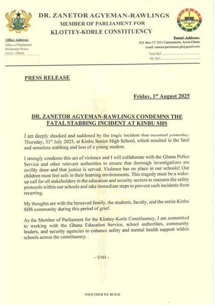 Klottey-Korle MP Dr. Zanetor Agyeman-Rawlings has broken her silence following the horrific killing of a teenage pupil at Kinbu Senior High School, demanding swift justice for the senseless crime.